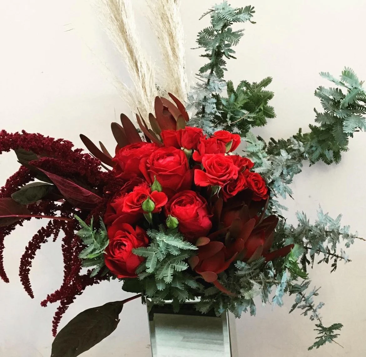 A luxurious statement arrangement featuring red roses, spray roses, cascading amaranthus, burgundy leucadendron, and rich textural foliage, artfully styled in a large vase.